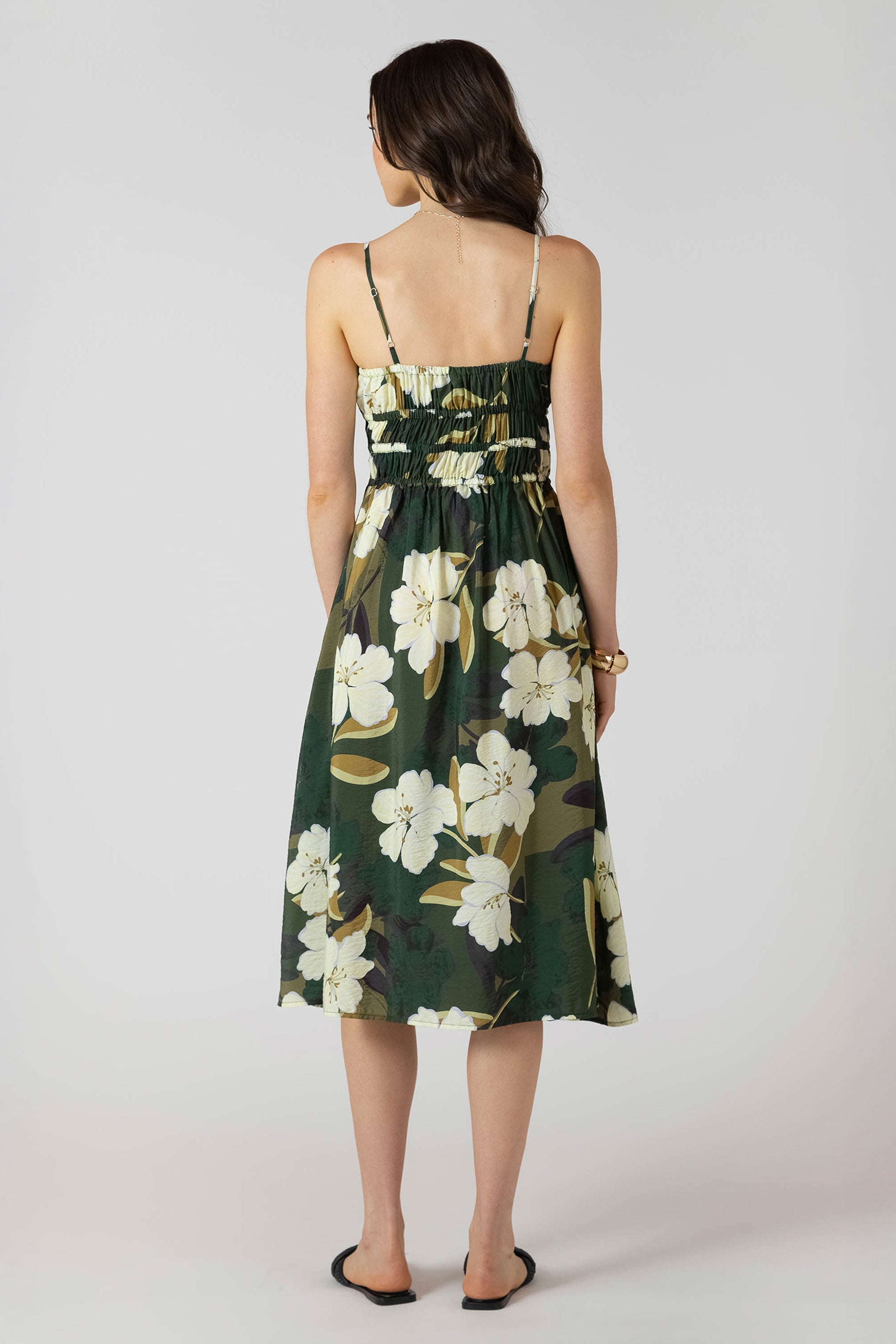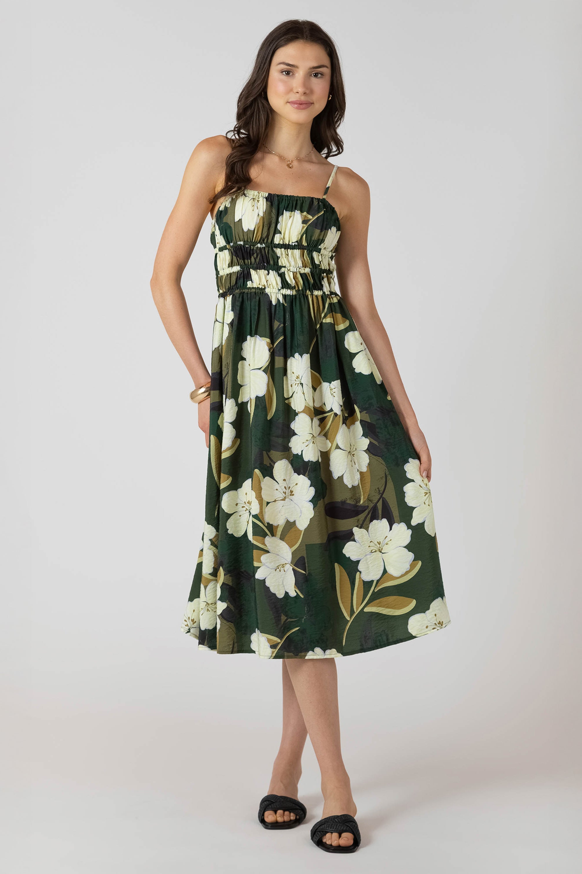 This smocked midi dress is designed to feel as easy as it looks. The fitted bodice offers comfortable stretch and shape, while the flowing skirt creates soft movement with every step. The result is a flattering silhouette that feels both relaxed and refined.