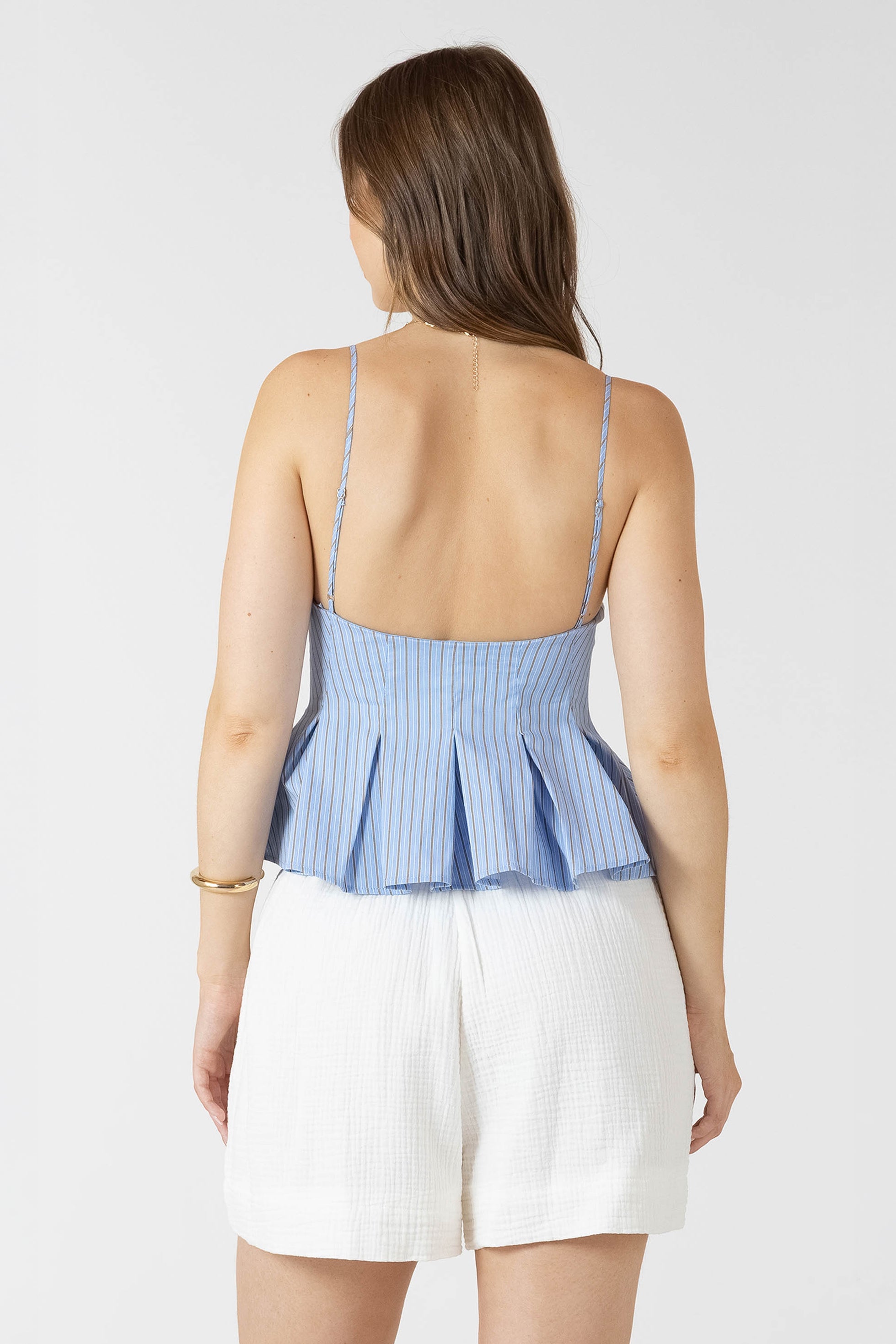 This sleeveless top is designed to sculpt and soften at the same time. The fitted bodice defines the shape, while the flared peplum hem adds movement and a playful finish. Delicate straps and a subtle sweetheart neckline enhance its feminine feel, balanced by a clean button-front detail.