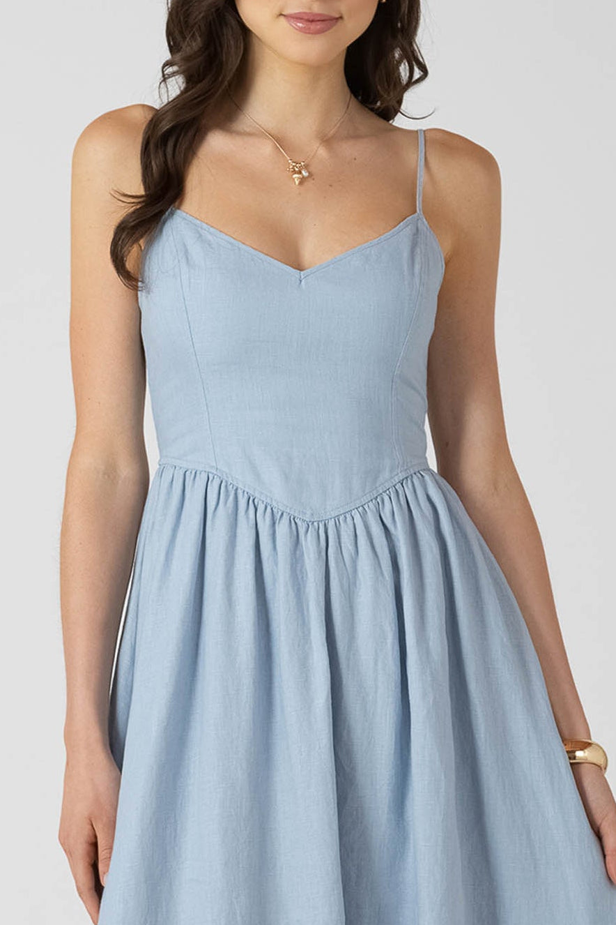 This midi dress is designed with a flattering fitted bodice and a softly gathered skirt, creating an effortless silhouette that flows with ease. Delicate straps and a clean neckline keep the look minimal, while the shape adds just the right amount of softness and structure.